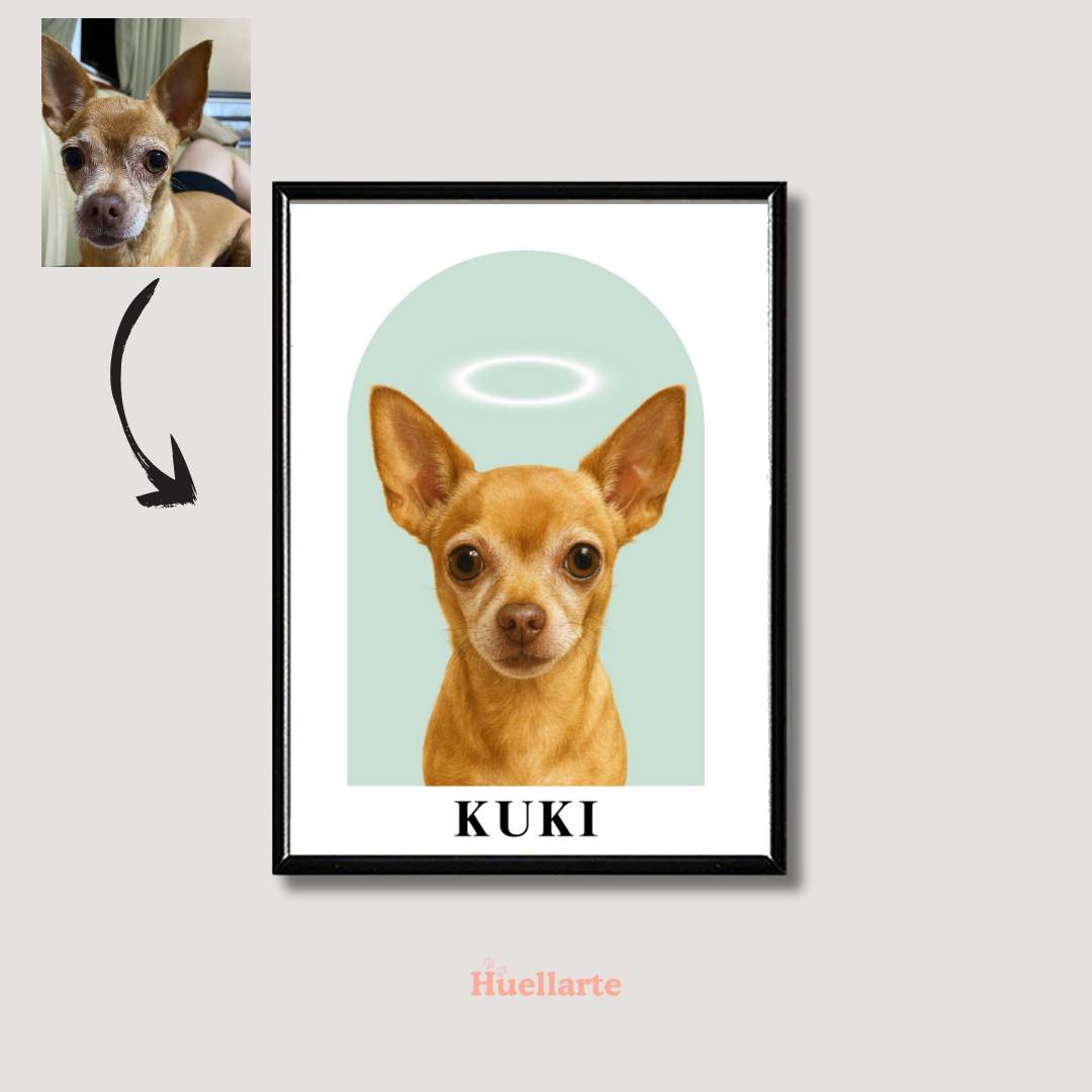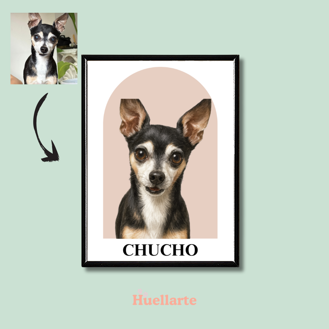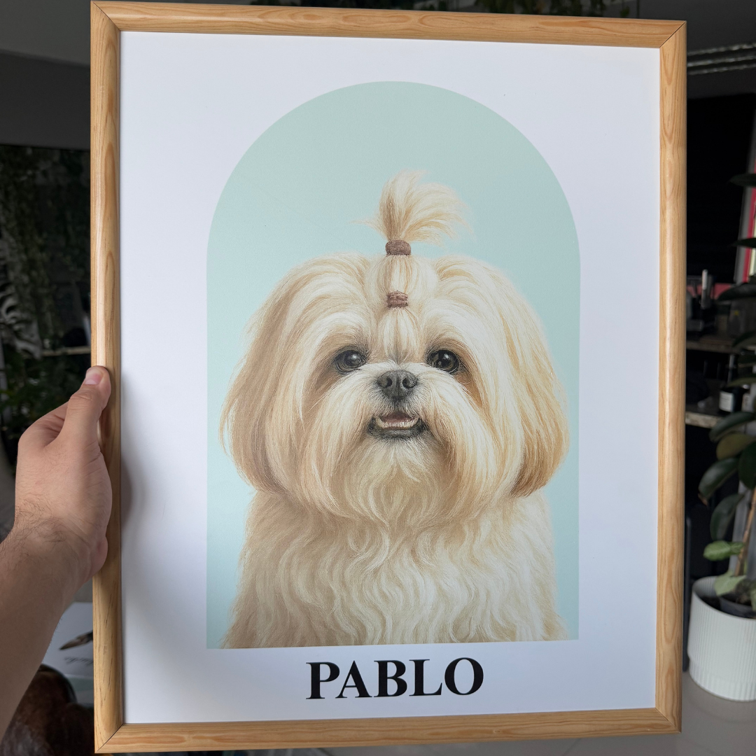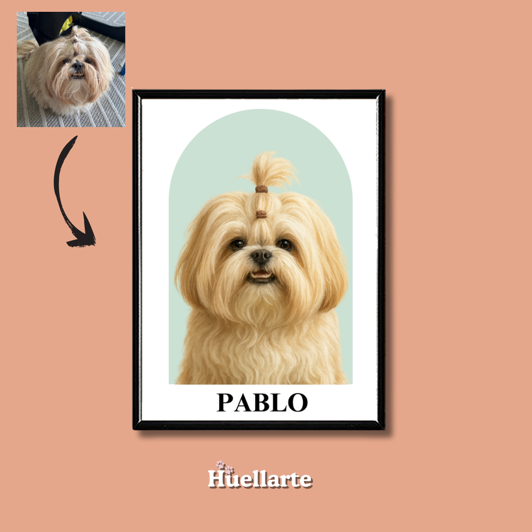 Una obra de arte impresa profesionalmente y enmarcada de tu mascota, creada a partir de la(s) foto(s) que subas.